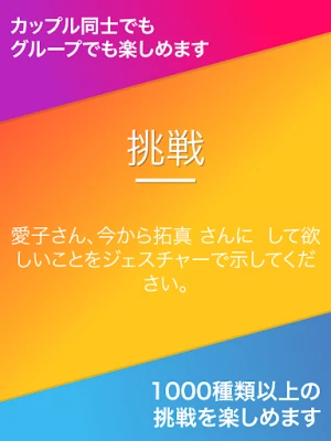 最高の「真実か挑戦」ゲームで、夜を特別なものに。カップルや友達グループで盛り上がれる、刺激的な質問やキワドイ罰ゲームが満載。忘れられない体験をあなたに。